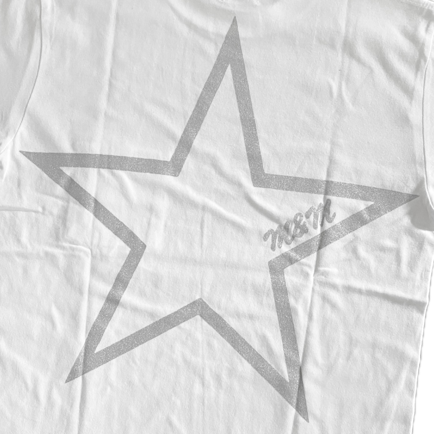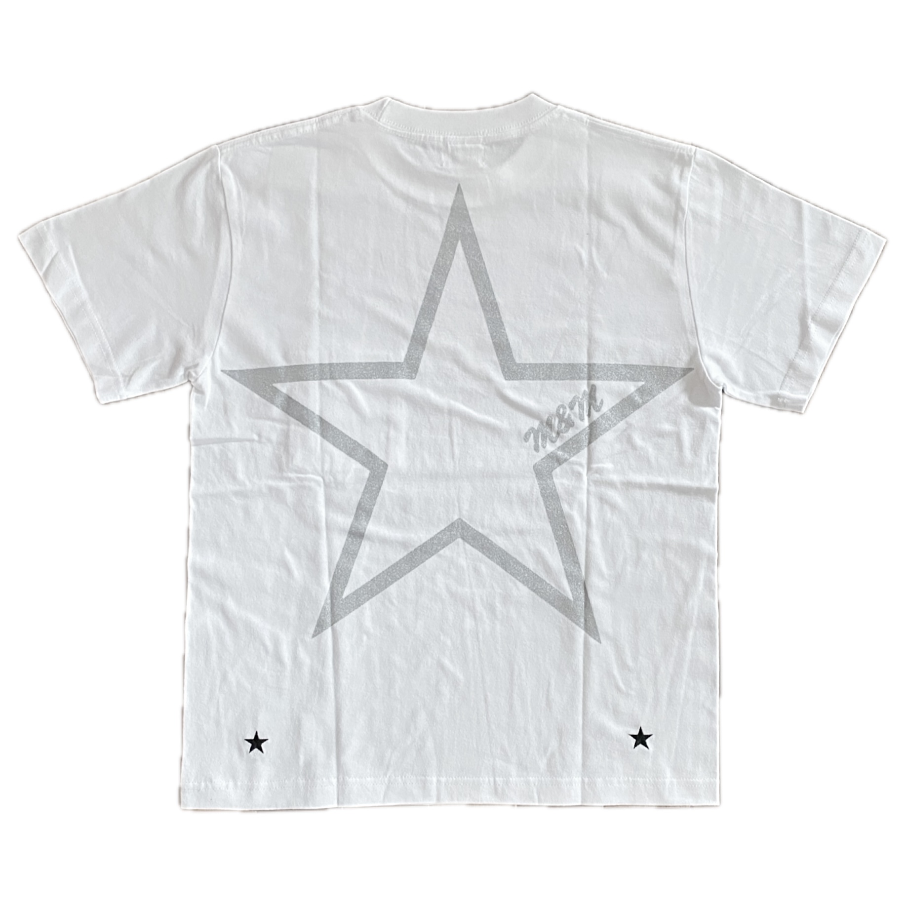 エムアンドエムのエッジスターポケットTシャツ(カラー:ホワイト)になります。背面裾口に星の刺繍(シルバー)、フロントポケットにロゴプリント、バックにオリジナルデザインがシルバープリントで施されています。5,6オンスボディ。